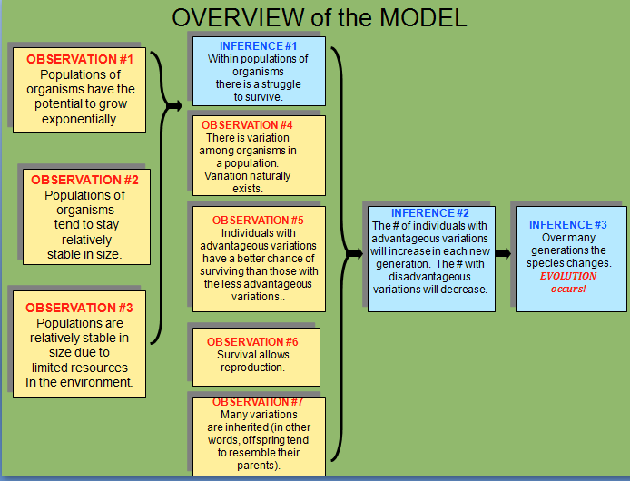 A sample model for a HS biology evolution unit. The model shows how students make several observations, which guide them to make key inferences regarding evolution.