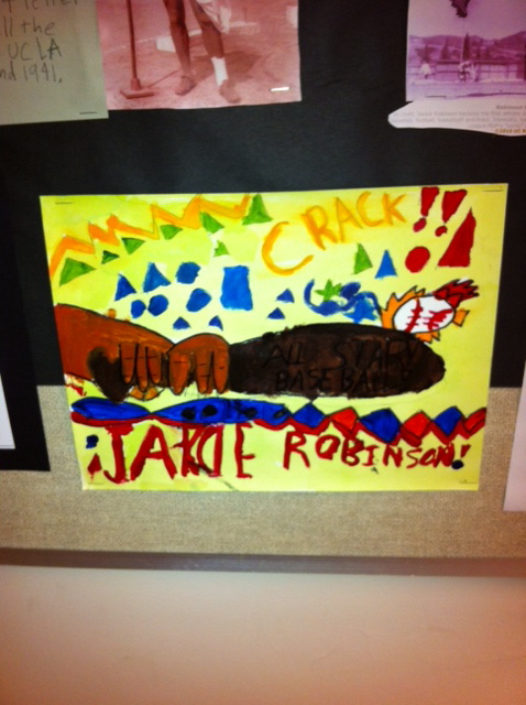 Students represented their learning and thinking on the people they had been researching by creating paintings in the style of various artists we had studied throughout the school year. This student is showing how Jackie Robinson cracked open the practice of segregation in major league baseball in the style of Roy Lichtenstein's art.
