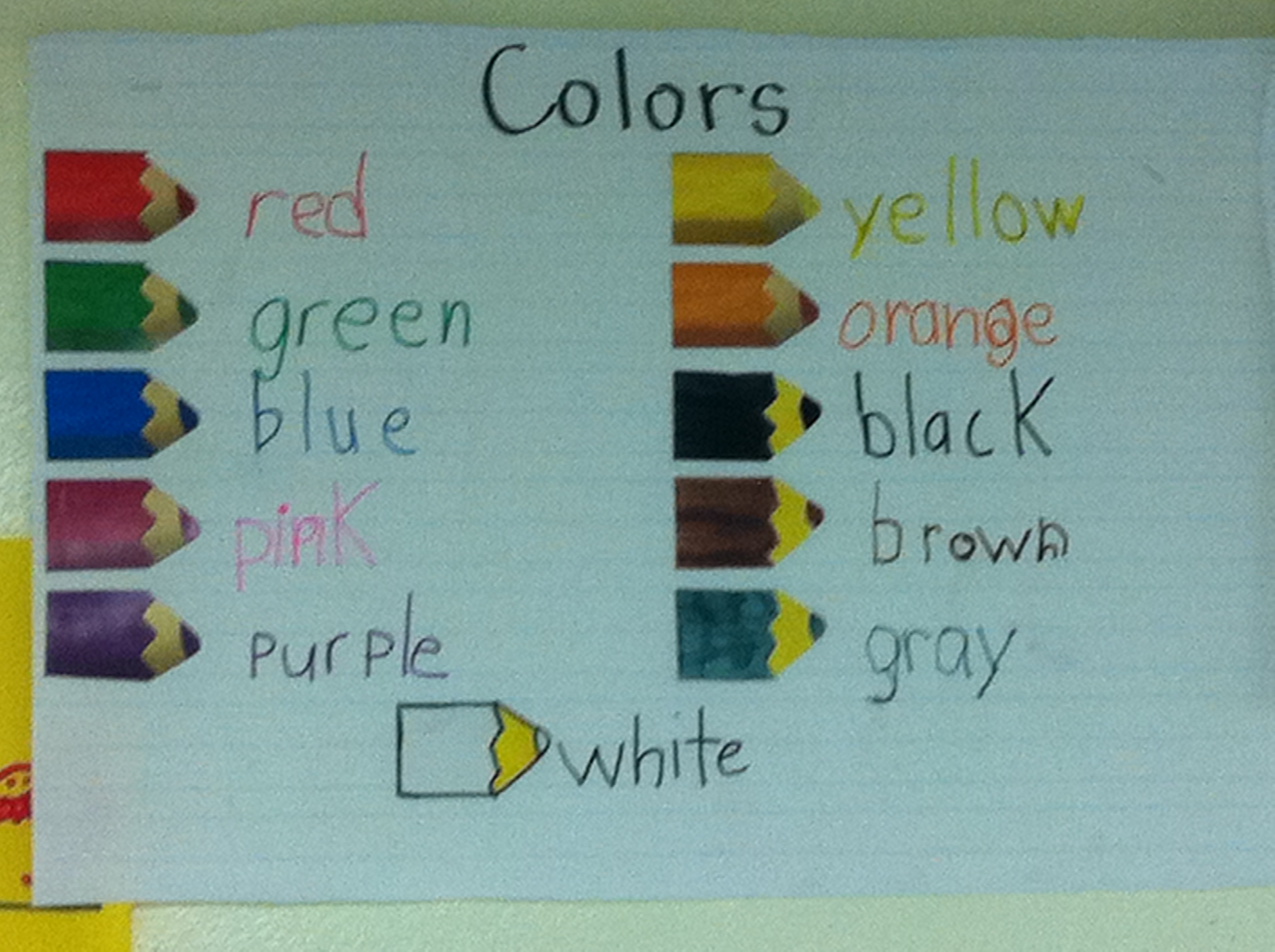 Sample of a Interactive Writing Color Chart which is created with the students. After its completion, it is posted in the classroom as a writing reference tool.